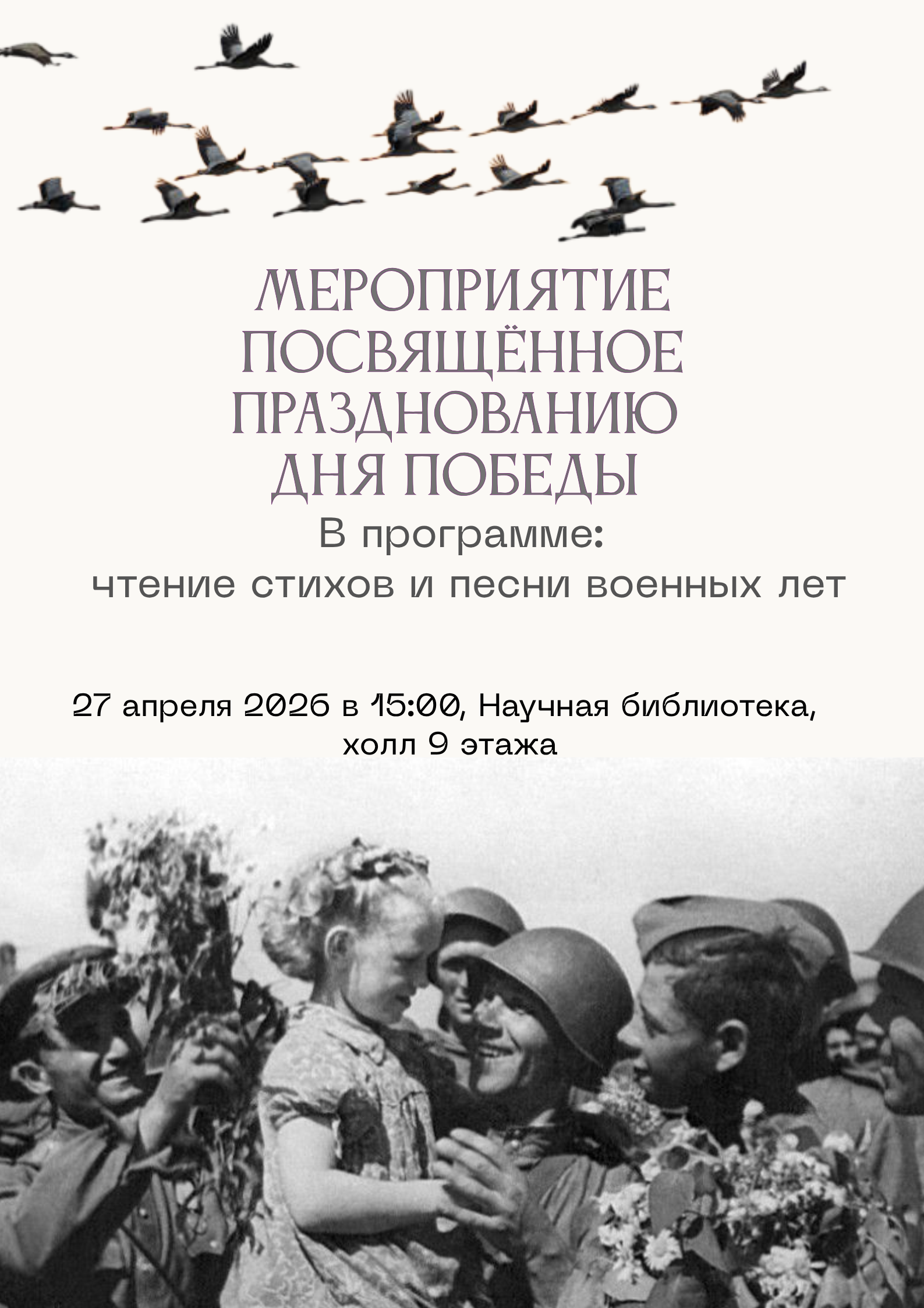 В преддверии празднования Дня Победы, Группа культурных проектов Научной библиотеки совместно с Военно-учебным центром приглашает вас на патриотическое мероприятие, которое состоится 27 апреля в 15:00, 1 корпус, холл 9 этажа Научной библиотеки.